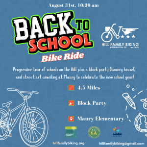 Come celebrate the new school year with Hill Family Biking on August 31st at 10:30 for the annual Back to School Ride and Block Party – a 4.5 mile bike ride touring Capitol Hill schools on the northern part of the Hill including Ludlow-Taylor! Join the ride at the Ludlow-Taylor parking lot on 7th St NE or start at the beginning of the ride at Maury Elementary.